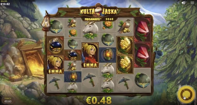 Step into a lush, nature-filled world where mining for gold is the main event. The symbols you’ll see include Gold, Pick, Lantern, Dynamite (the scatter), Jewel, Flower, Rock, Bird, Deer, Kettle, and Emma. Every icon fits the mining adventure theme, offering a mix of earthy and valuable finds as you play.